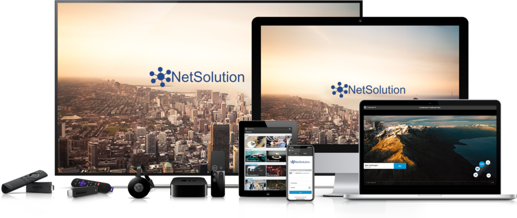 The NetSolution platform aggregates content from various sources – live or on-demand. Provisioning can be done manually through a web-based interface or programmatically.